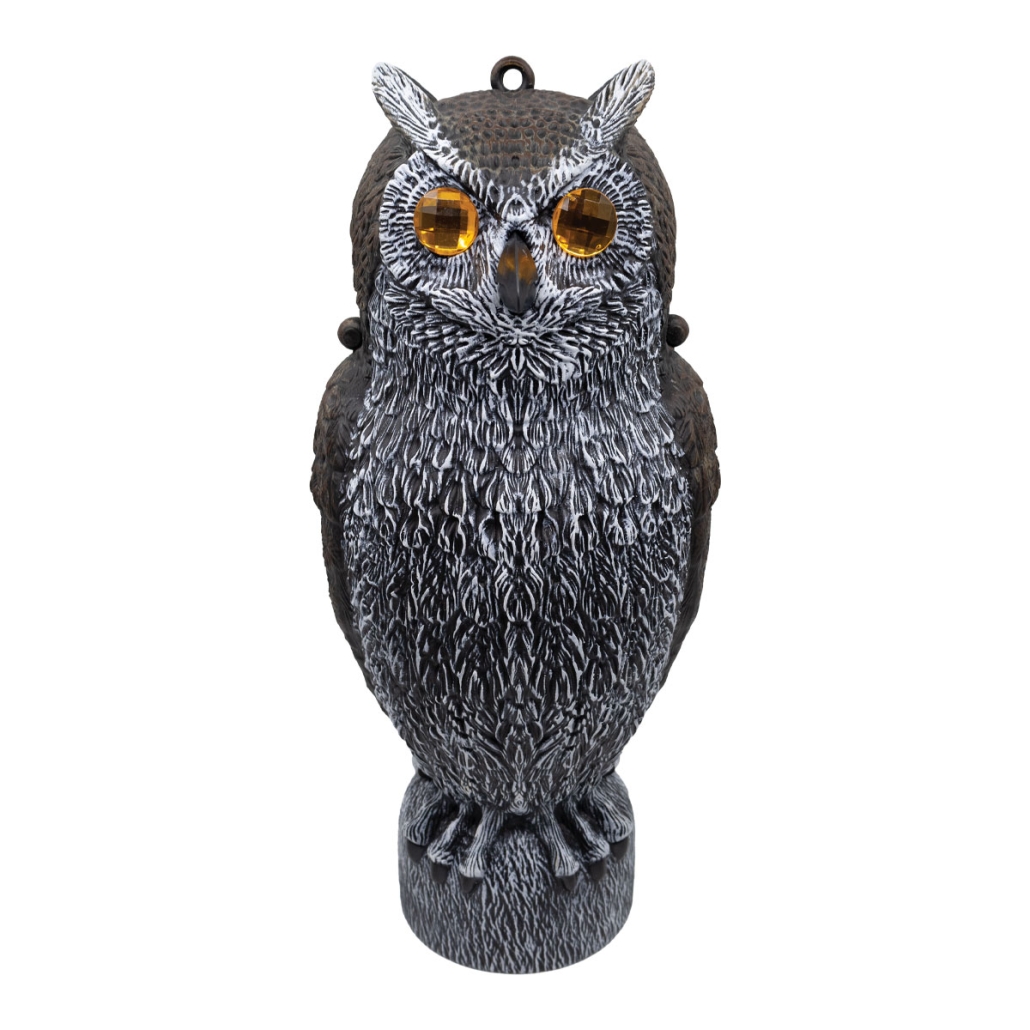 The Sparkle Sentinel Owl is a realistic predator decoy designed to discourage the presence of nuisance birds and animals. Its detailed, textured body and reflective eyes create a lifelike appearance that may help reduce pest activity in certain areas.